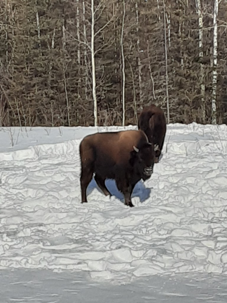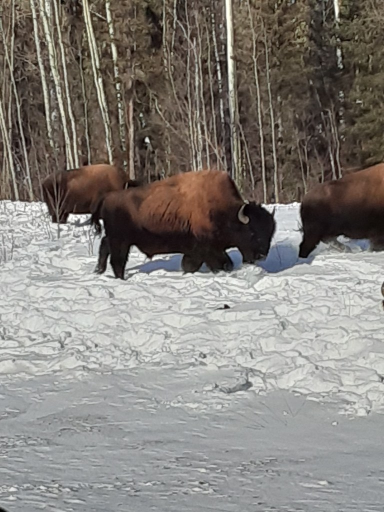 In the 136 miles between the hot springs and Watson Lake we saw 103 (or was it 106?) Wood Bison! The largest group was 53 which included calves.