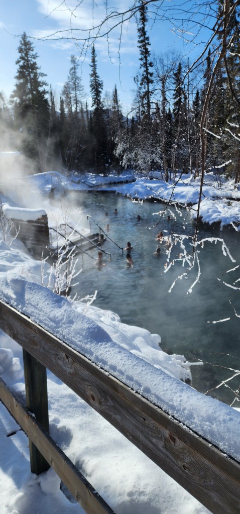 I loved that there were First Nations people from elders to children also enjoying a soak. They have used the spring for generations. On the walk out a man pointed to weasel tracks in the snow.