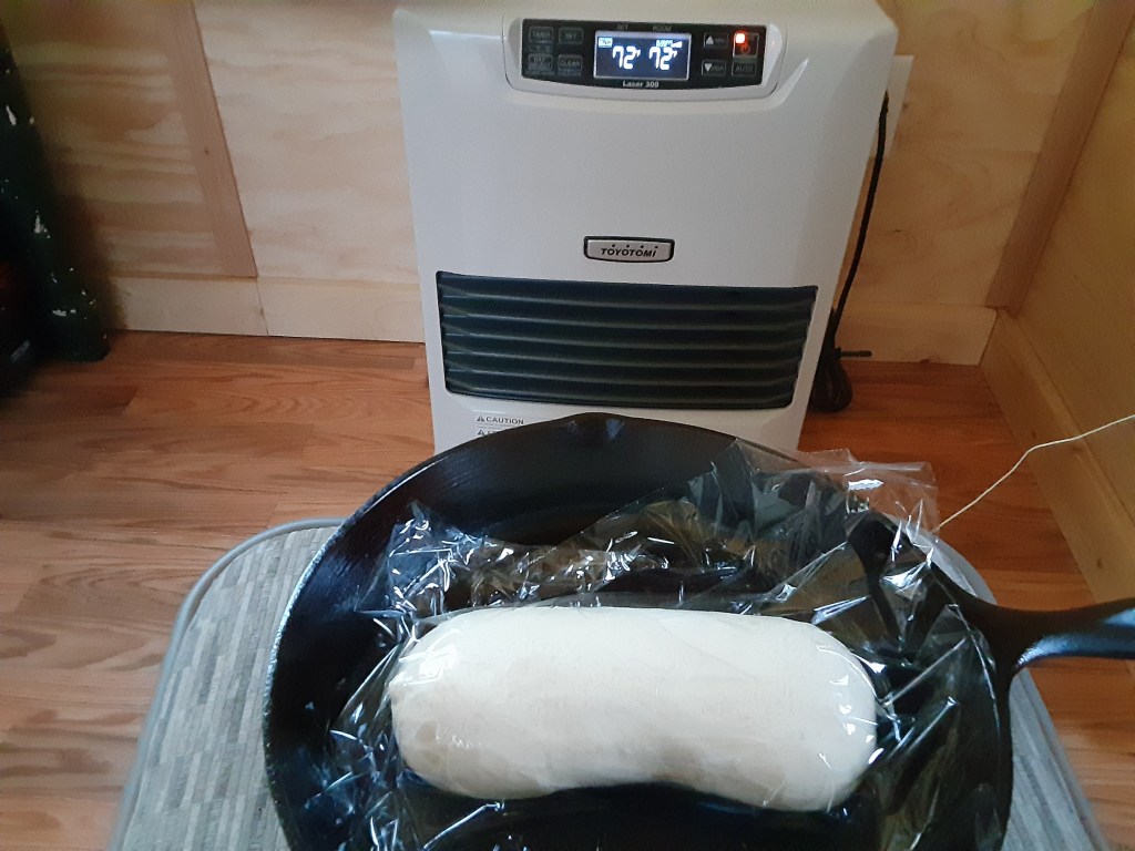 Inside I have the Toyo oil heater cranked up to 72F and bread is rising slowly. This Rhodes bakeNserve frozen dough is supposed to go into a loaf pan, but I have been making do with a cast iron skillet. Charlie will probably eat half the loaf when he gets home from Las Vegas this afternoon.