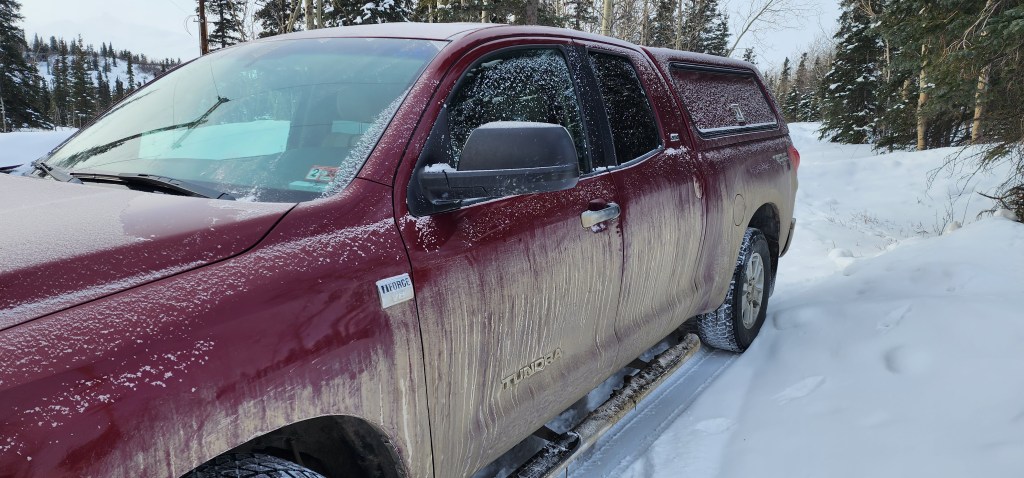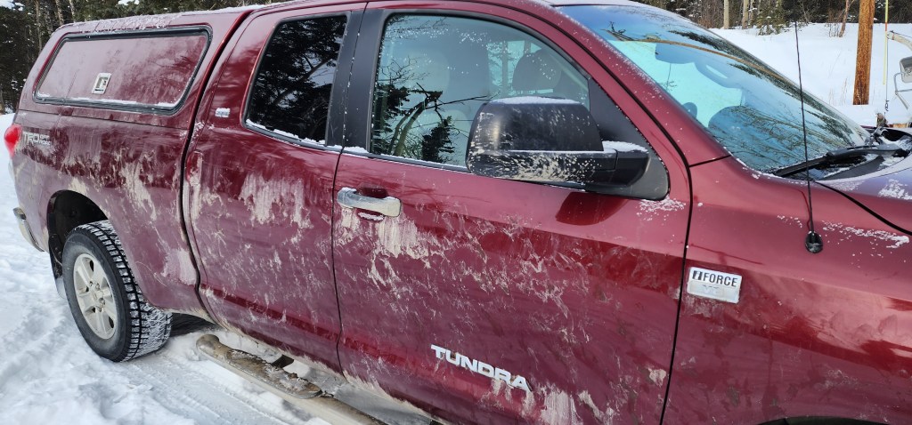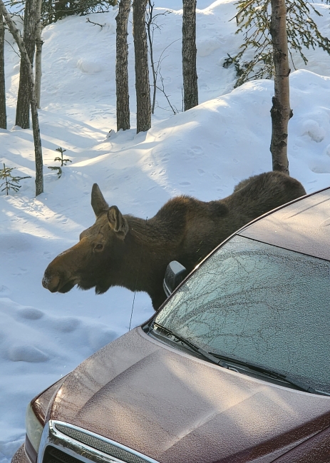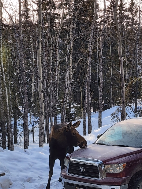 A young, skinny moose (2 years old?) spent nearly an hour licking the road salt from our truck this morning.