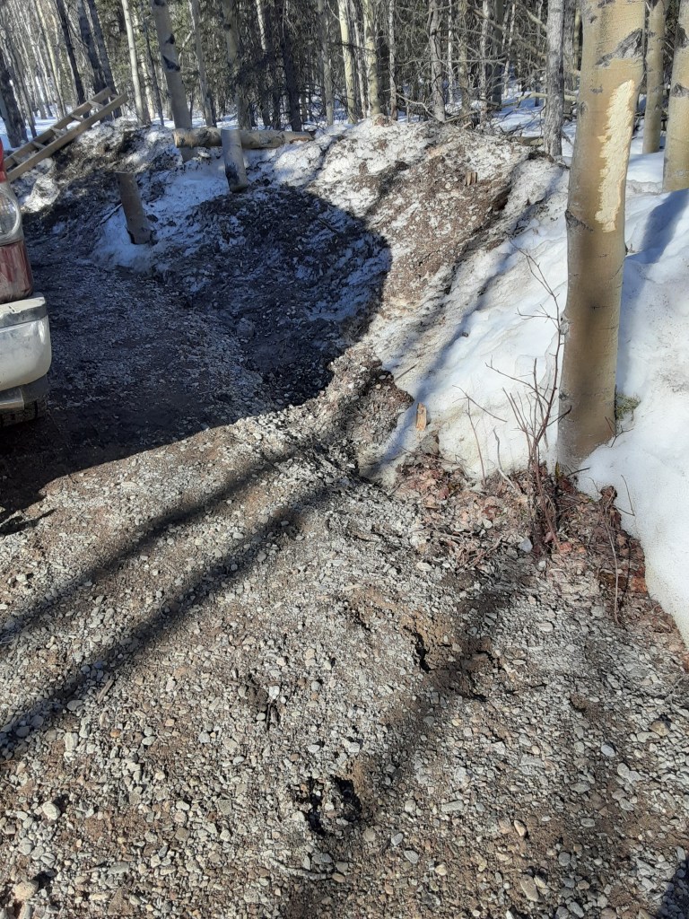 When we returned from Fairbanks it was clear moose had been visiting. All of the snow melted from our plowed driveway leaving it very soft. Great for seeing lots of moose prints!