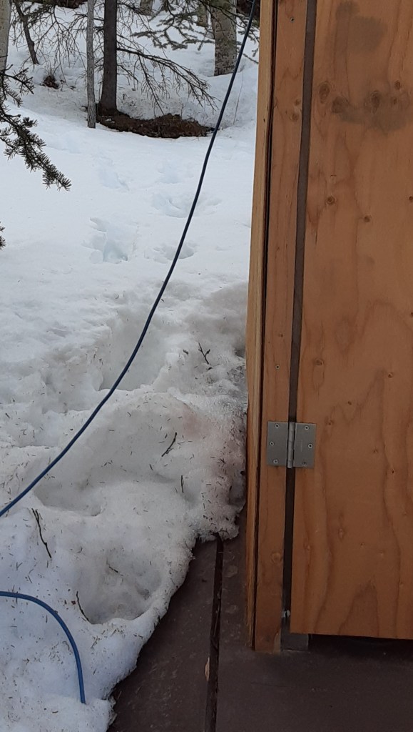 We followed moose sign back our outhouse path. When he hit the outhouse he went onto the landing & then right beside it. Glad I wasn’t in it when he went so close!