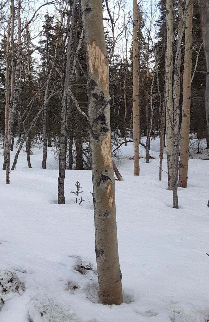 The moose strip bark from aspen using their bottom incisors (they don’t have top incisors, but do have both top & bottom teeth much further back in their mouths). Below is some fresh stripping along the outhouse path.