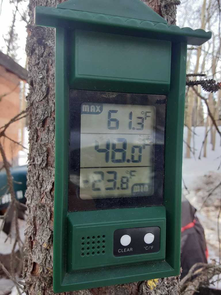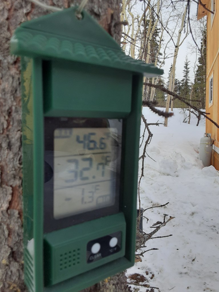 Since mid-March the temperature has ranged from -24F to around 75F, though our max/min thermometer shows higher when it gets in the sun. Toward the end of the post I show max/min reading by month.