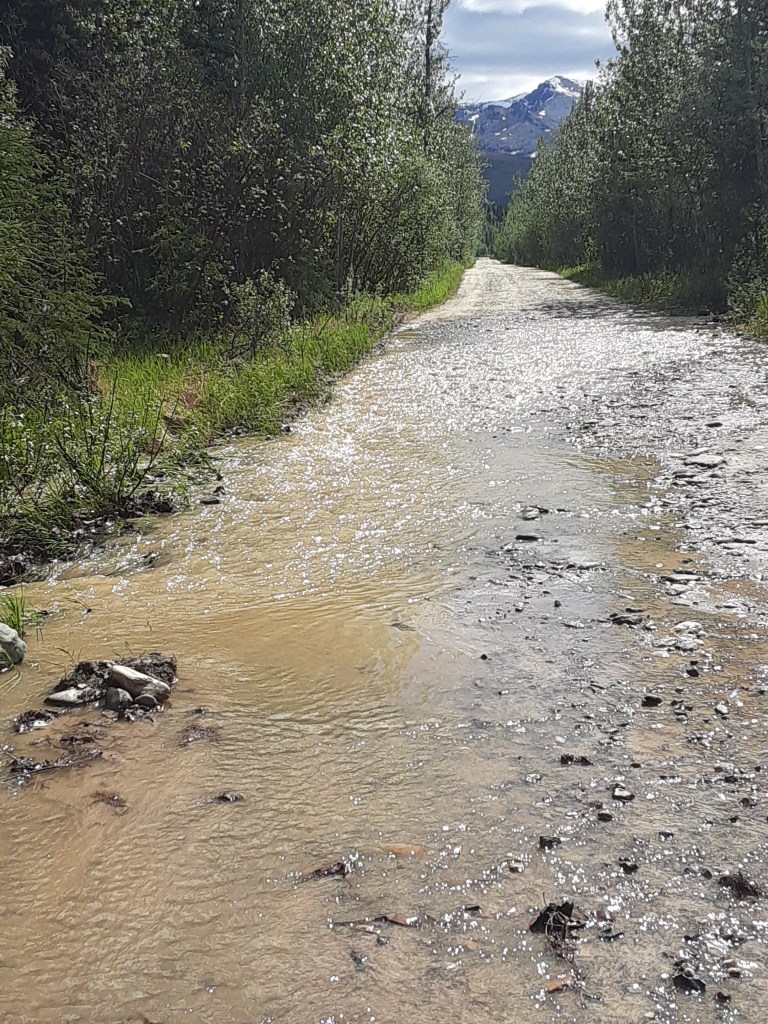 Here sunny, hot, dry weather means the river is raging and water runs across and down our road. Sunny weather has caused much higher water levels than rainy weather. I am tempted to bushwhack upstream to see just what snowfield is melting to cause such dramatic runoff. It is far enough away that there is a significant lag. It is roughly 12 hours from the peak heat to the peak water levels.