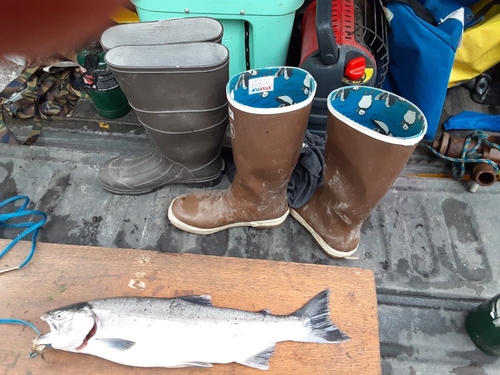 Sept 9 – We moved to Caswell Creek. So many fish, though most past their prime. I caught and released a very blush coho salmon. C caught and released several blush coho before catching a bright one for our lunch. Then he caught and released even more, for 7 total coho (plus one accidentally snagged rather than caught legitimately). He also caught a chum.