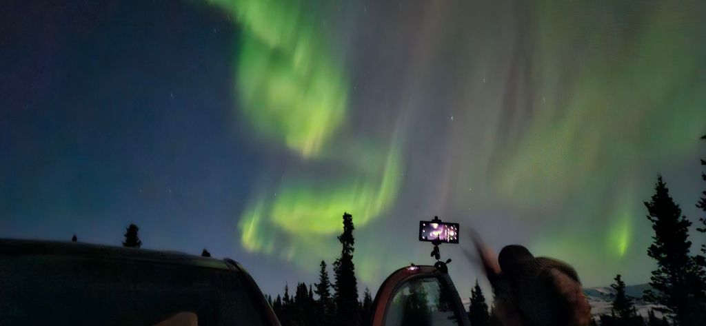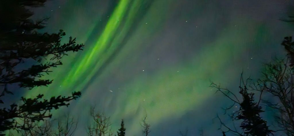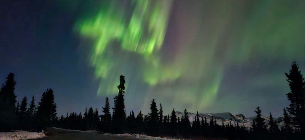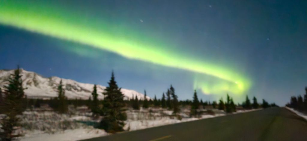 Astronomical twilight (the darkest it gets this time of year) started at 12:06 early this morning. Since it was a clear night I had set my alarm for 12:20 am. I wasn’t expecting much as the forecast kp index was only a 3. To my surprise, there was some color in the sky, dramatically obvious when I took a photo out of the bedroom window. I showed C and told him I was going outside. He proposed we drive into Denali NP, and thank goodness I agreed. The next 3 hours were spectacular!