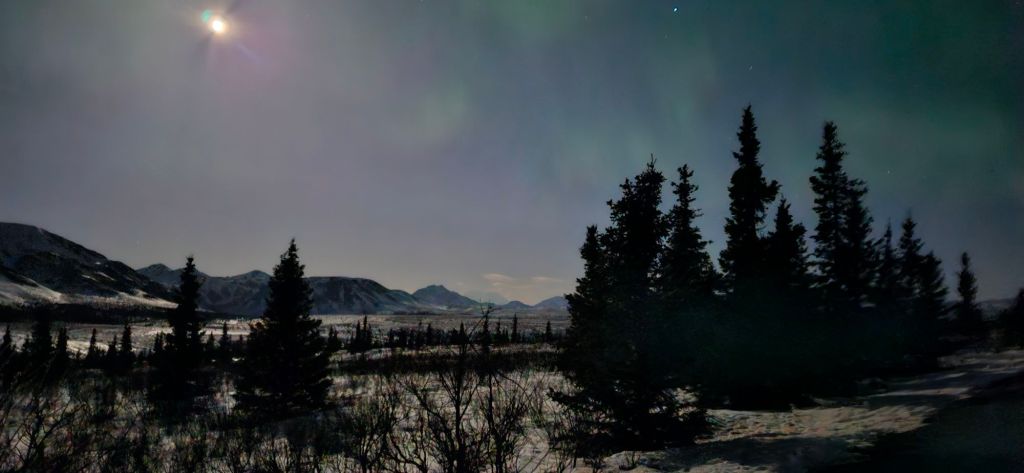 The above photo isn’t great, but I managed to capture the nearly full moon, spots of Northern Lights, and Denali itself at 2 am (Denali is the very faint mountain in the center, many miles away). At the below link are some photos from a daylight trip into the park a year ago, https://roaming-nature.com/2023/04/25/snow-covered-mountains/