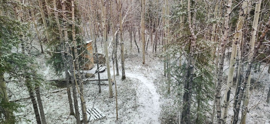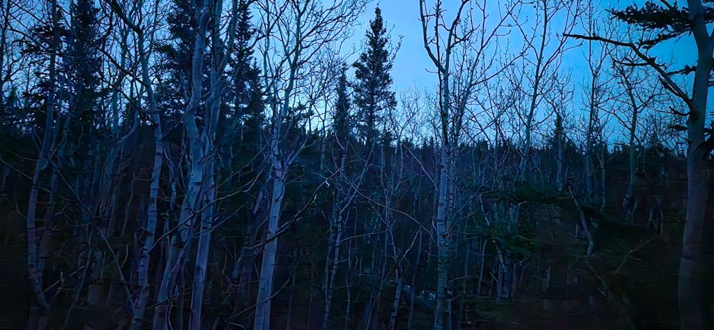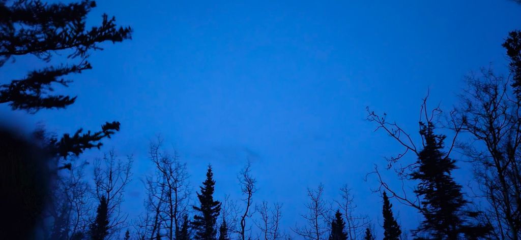 If we had indoor plumbing, I would have used it when I got up in the darkest part of the night to check if the Aurora was visible.  But it wasn’t urgent enough to get dressed and go outside in the 30ish degree night.  Not even urgent enough to pee in a bottle (not that I mind the first step, but I didn’t want to have to empty the bottle later).  While much of the US is enjoying excellent Aurora viewing during the current solar storm, so far, it is too light and/or too many clouds here.  Despite repeated attempts during the darkest few hours that we get, I have seen nothing but the indigo sky of nautical twilight (see photo above, lighter blue on the eastern horizon as seen below).