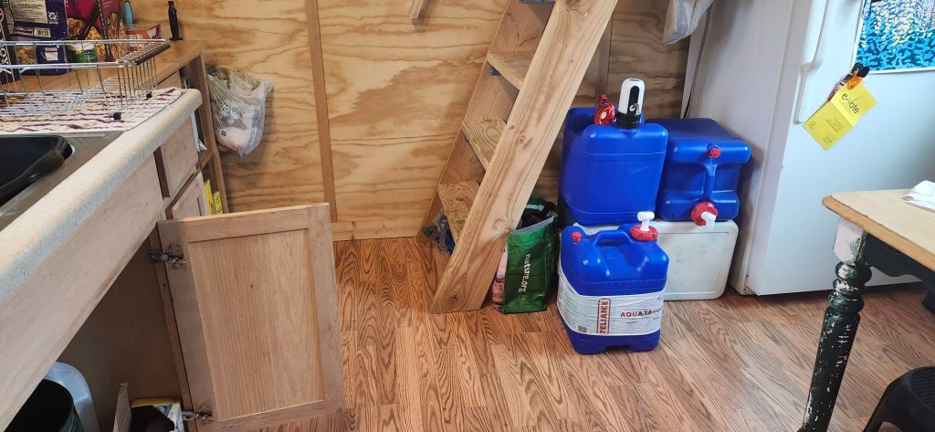 Back inside, I use the first water for the day, drinking and heating up water for tea.  Most of the water we use each day goes into our bodies.  Since any water that goes down the drain splashes into a bucket under the sink (top of bucket barely pictured above), I can clearly see how much water we throw out after rinsing produce, washing the dishes and our hands, and brushing our teeth.  Since we shower and do laundry elsewhere,  the slop bucket averages about 3 gallons a week.  I like to dump it twice a week so it doesn’t get heavy or smelly.  I haven’t overflowed the 5 gallon bucket here yet, but did overflow once in our first dry cabin in seasonal park housing.  Before I knew how to be efficient,  we were dumping 4 to 7 gallons per day!  Now we don’t have that much grey water in a week.  In seasonal housing, fresh water was only 150 yards away, and there was an excellent grey water disposal system.   Now water is a 20-minute drive, and the disposal is in the yard.
