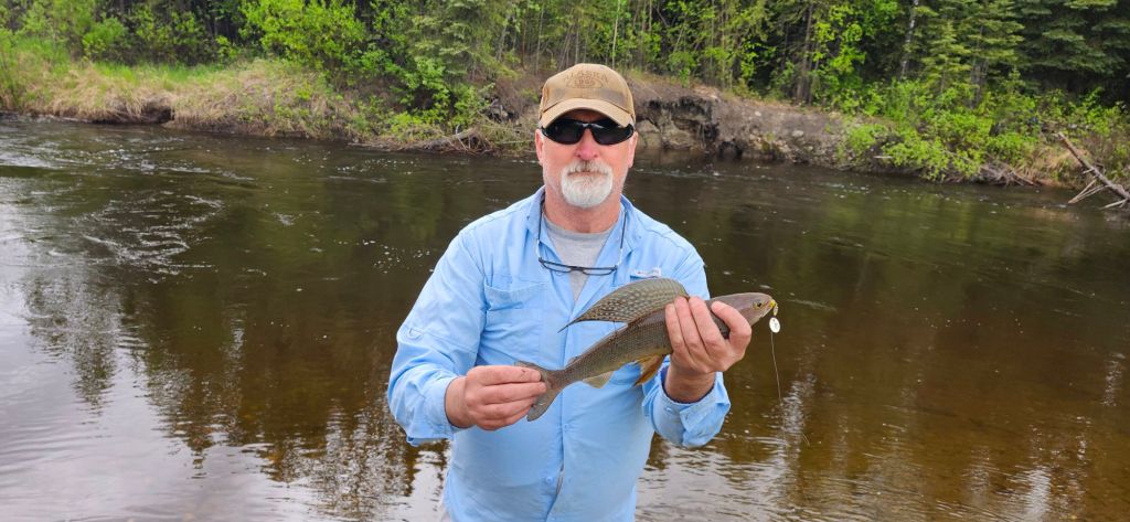 Yay, we still had a day and a half to travel 260 miles. That gave us time for some more fishing. At North Bonanza Creek we finally found some fish. I had some nibbles, and C caught a beautiful 14.5-inch Arctic Grayling.