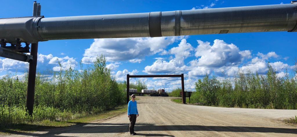 The pipeline weaves back and forth across the Dalton Highway, then continues south to Valdez. It is 800 miles long.