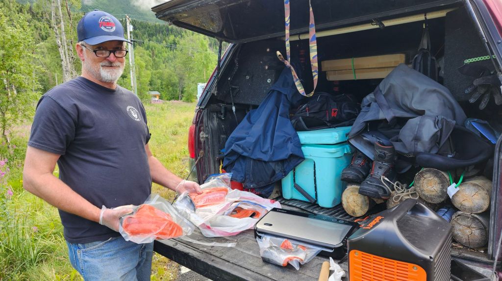Three days into our trip and our little freezer is almost full with the 4 sockeye C has caught. We are getting better and faster at putting up our catch on the tailgate or at a picnic table. The vacuum sealer takes very little power from the Jackery. In order to run our little mobile freezer, we alternate using the Jackery, and then using the generator to simultaneously run the freezer and recharge the Jackery. Once all the fish is frozen solid, we can unplug the freezer for a bit and recharge the Jackery using solar, but so far we haven’t been able to fit solar into the rotation.