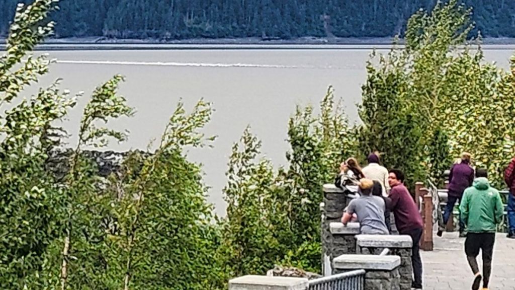 That evening we saw two small waves. We’re not sure if the bore tide wasn’t very big, or if we were moving at the wrong times. We started at Beluga Point, where we saw turbulence and fast rising water, but no long waves. Then we drove down to Bird Point Scenic Overlook, where we saw a cool, very long wave, but it didn’t look very high – maybe a foot? See the photo above. No one was surfing it, that is for sure! We hung around a while at Bird Point after almost everyone else had left. Then we drove north to Bird Creek, and while looking for fish in the creek, a significant wave surprised us, moving upstream . It was only a few inches high, but going against a strong current. It stirred up a lot of mud in the clearwater creek. It was just that one, single wave. Weird!