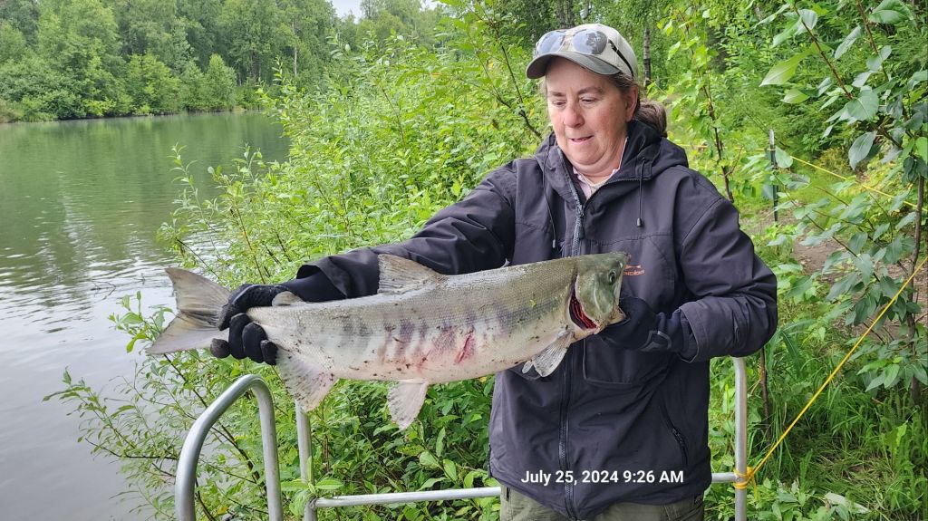 Last year by August 9 we had only caught four fish. https://roaming-nature.com/2023/07/03/sockeye-bears/ . This year we have been able to get out more, plus we have broadened our skills. We already have caught (and mostly released), 53 Arctic Grayling (me & C), 1 Lake Trout (C), 1 Chum Salmon (me) and 21 Sockeye Salmon (C).