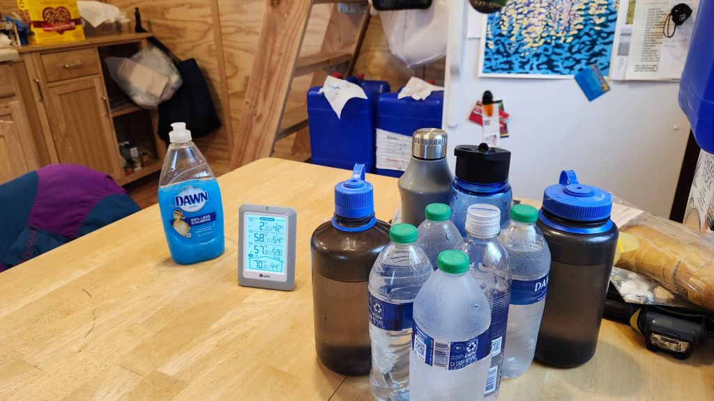 Top priority tomorrow is to drive 20 minutes to get water. Our 6-gallon aquatainers are completely empty (if we had left water in them, it would be frozen, like the dish soap, cooking oil, etc). We have a little more than a gallon of water, which should be enough for drinking, dishes, tiny bit of cleaning, sponge bath, and brushing teeth until we get 20 plus gallons tomorrow. The 20 gallons should last us 2 to 3 weeks, provided we go to town for showers and laundry.