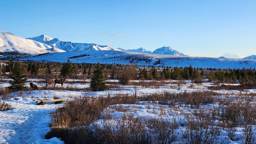 The remaining 14 were all near Park Road. Roughly guessing where they were on the road: there were 11 moose around mile 12; 2 around mile 7, and 1 around mile 5.