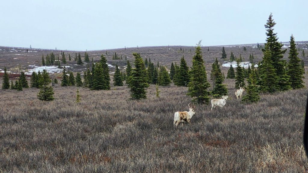 We finally saw our first caribou of 2025, just above Teklanika River. There were 2 mature females. One of these had large antlers for a female, including a shovel (brow palm). There was also a yearling with little antlers. The youngster could be a male or female and should shed its antlers soon.