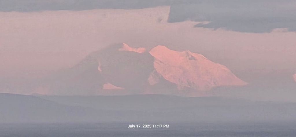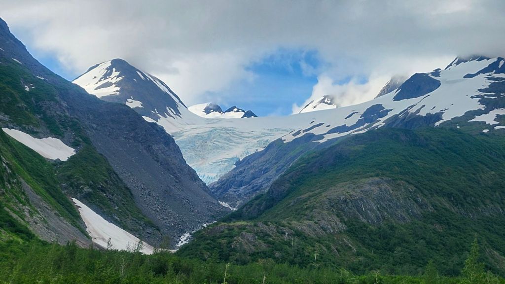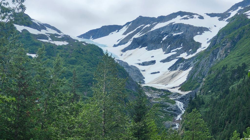 We finally made a trip to Portage Glacier, staying 2 nights at nearby Williwaw Campground. Thanks to lovely weather, we saw many glaciers. The above glacier and waterfalls were visible from the campground.