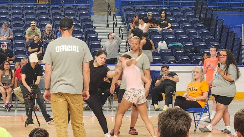 Above photo towards the left, a jingling boy and young girl head over to the regalia contest. To the right, 2 men practice the Dena Stick Pull. I love the positive energy at WEIO.