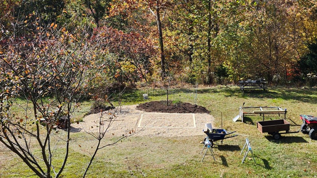 We chose to install the greenhouse on a flat area near an existing water spigot. The site has great sun exposure to the east and south, with some deciduous trees to the west.