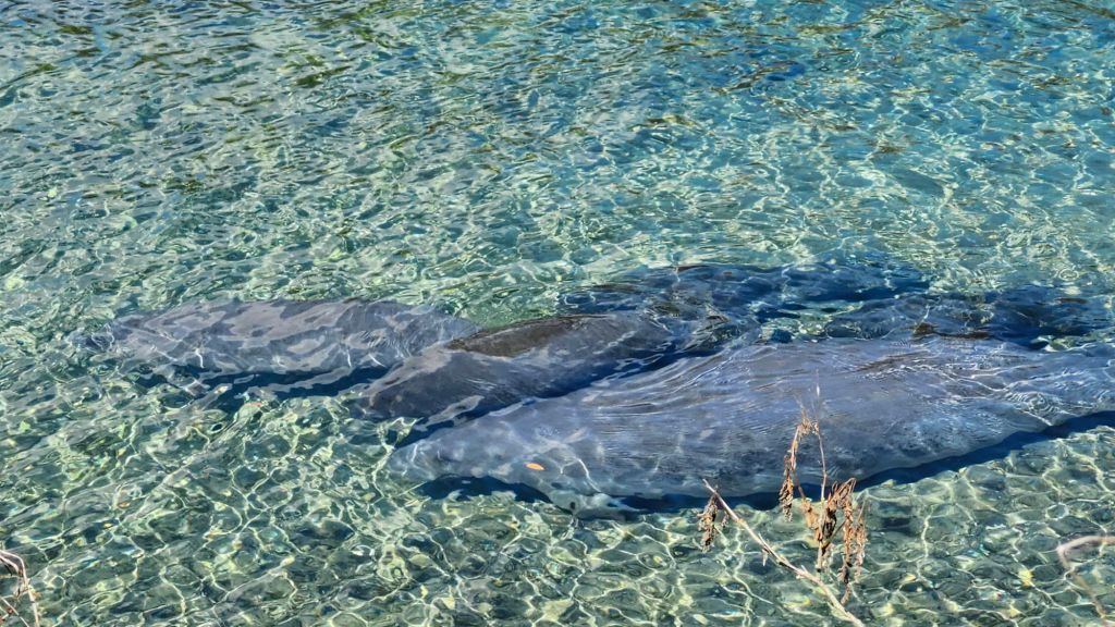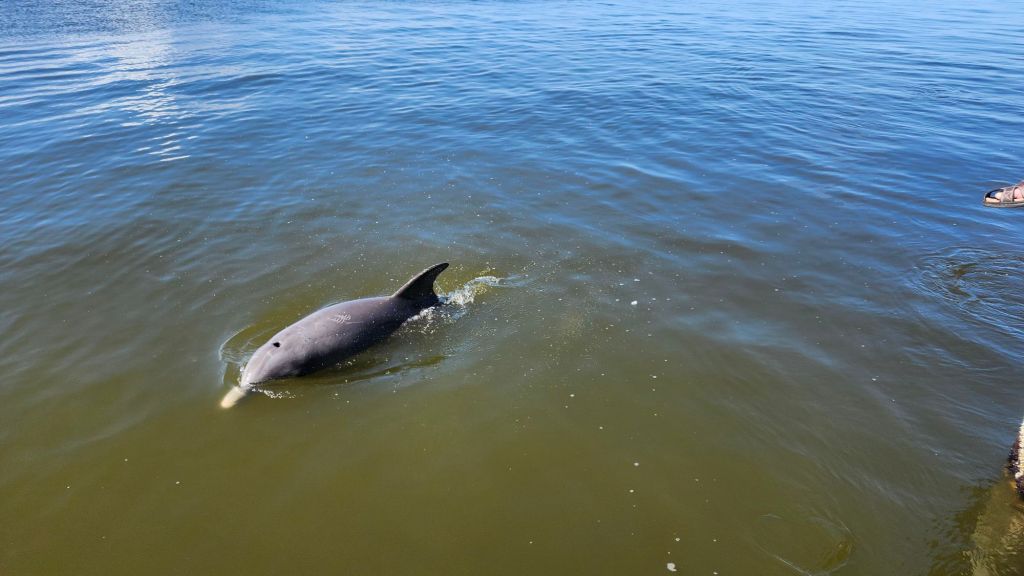 When we flew back to Florida, we meandered for several days (love this aspect of retirement!). C tried for tarpon and snook. The dolphins at Parrish Park were hunting so close to the dock! I was going to crop the photo of the dolphin below until I realized it shows C’s foot.